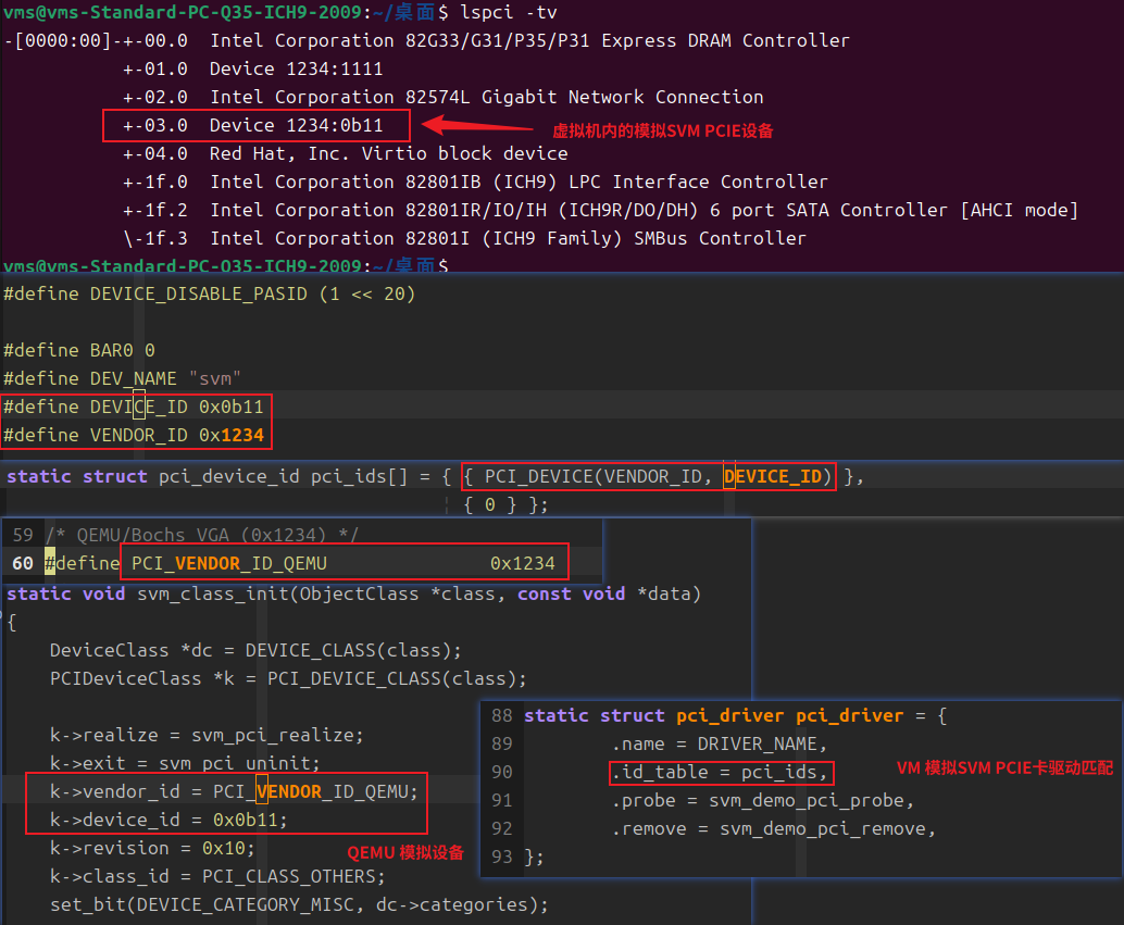 可以看到,VM内模拟PCIE设备BDF为00:03.0.其VENDOR ID,DEVICE ID和QEMU中模拟设定的完全一致,也可VM内SVM设备的驱动给定的匹配设备信息完全一致。