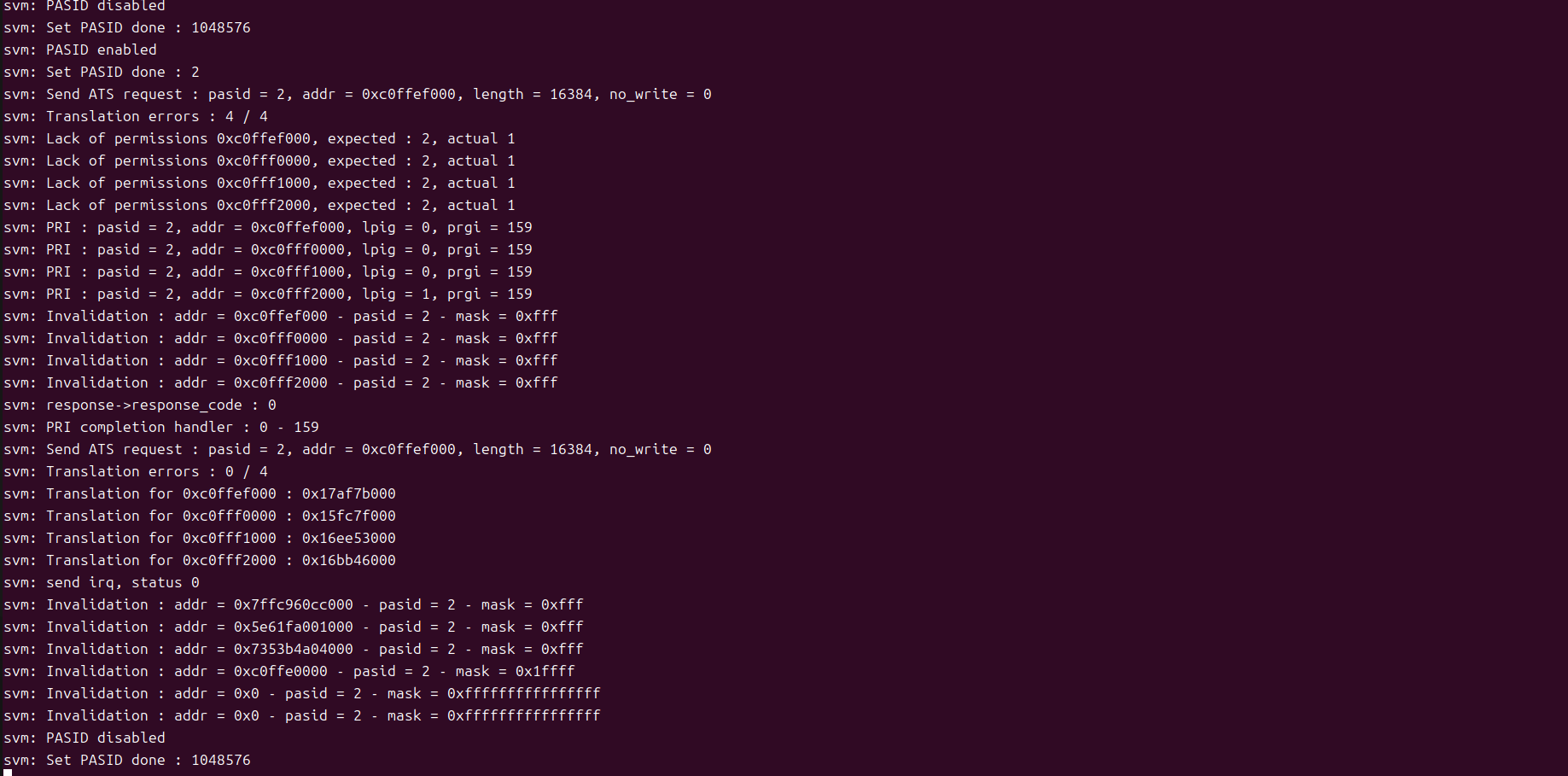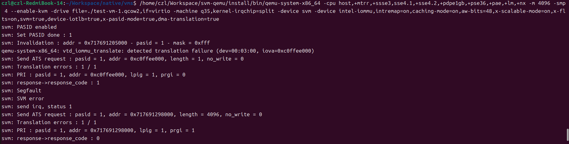/home/czl/Workspace/svm-qemu/install/bin/qemu-system-x86_64 -cpu host,+mtrr,+ssse3,sse4.1,+sse4.2,+pdpe1gb,+pse36,+pae,+lm,+nx -m 4096 -smp 4 --enable-kvm -drive file=./test-vm-1.qcow2,if=virtio -machine q35,kernel-irqchip=split -device svm -device intel-iommu,intremap=on,caching-mode=on,aw-bits=48,x-scalable-mode=on,x-flts=on,svm=true,device-iotlb=true,x-pasid-mode=true,dma-translation=true
