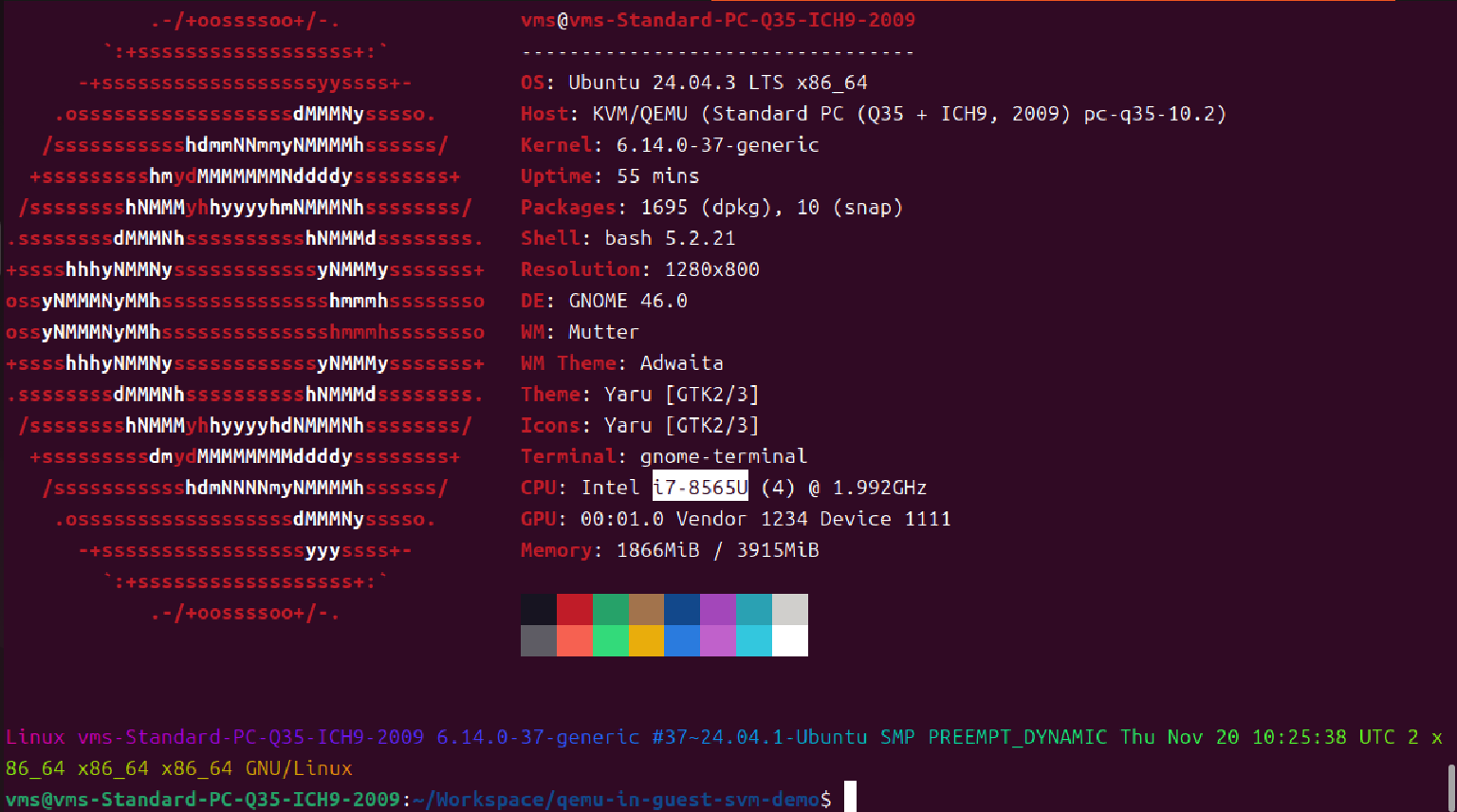 $ qemu-system-x86_64 -machine -q35 -m 4096 -enable-kvm test-vm-1.qcow2 -cdrom ./ubuntu-24.04.3-desktop-amd64.iso