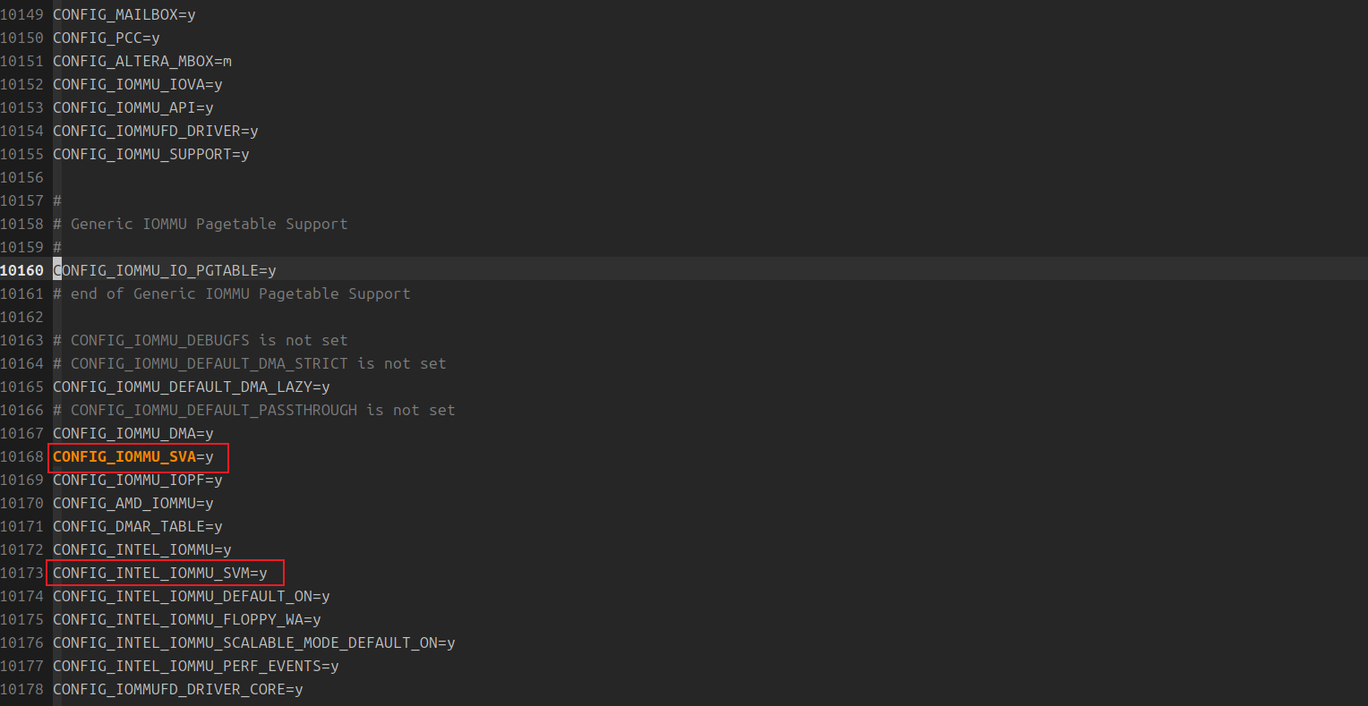 测试运行在VM中,需要VM OS KERNEL支持SVA 和IOMMU配置,由于HOST 和VM安装的是同一个版本的OS,所以在HOST检查相关配置CONFIG_IOMMU_SVA等是否开启,经过验证,ubuntu-24.04.3默认开启了对SVA的支持: