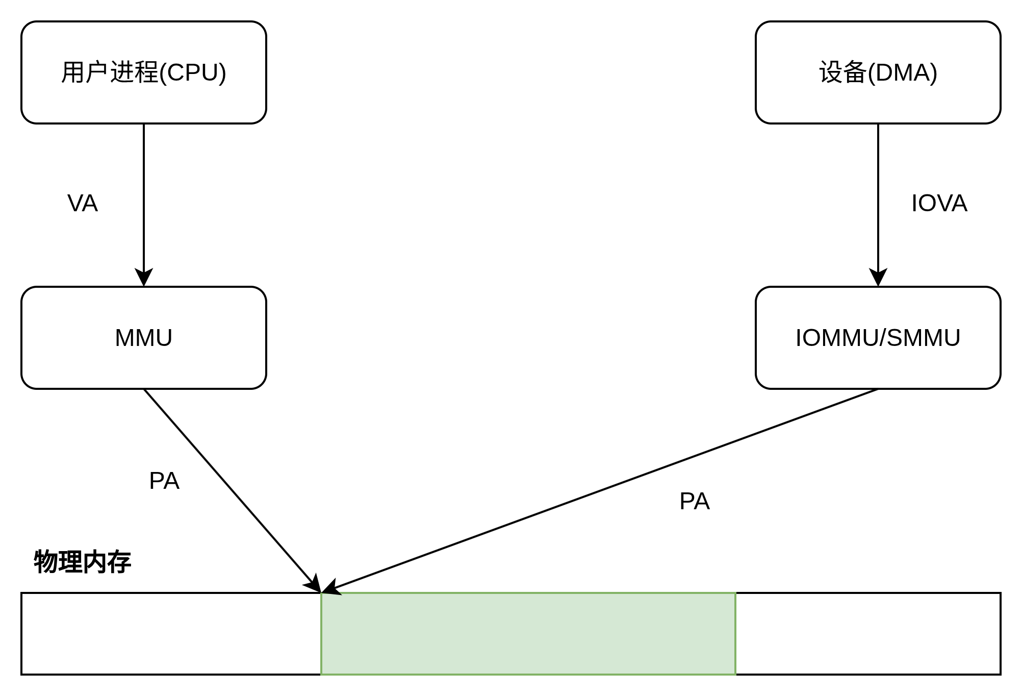 首先用户进程分配一块内存空间,用户进程看到的是 VA, 该 VA 对应到 PA,然后 IOMMU 将此 PA 映射到IOVA,设备看到的是 IOVA。那问题来了: