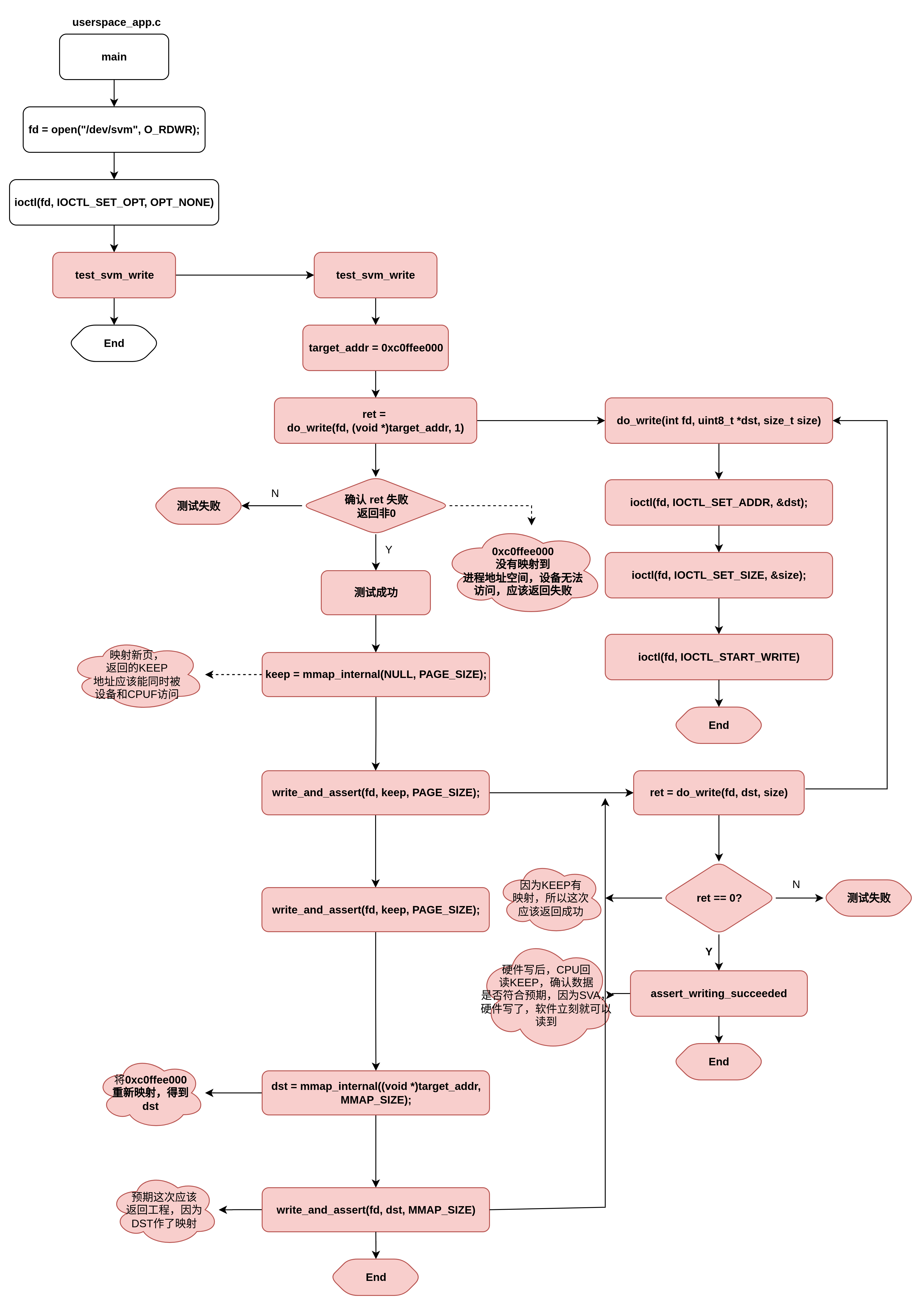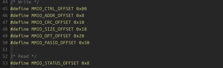 VM测试用例文件userspace_app.c,测试逻辑如下,首先给出一个没有映射到进程地址空间的地址0xc0ffee000给SVM PCIE设备访问,因为地址还没有映射到进程地址空间,所以测试预期应该返回错误。之后,随即映射一块匿名空间,给到设备区访问写入数据,然后给CPU读回来,由于此地址已经映射给进程地址空间,SVA机制下设备和CPU共享地址空间,所以可以立刻回读数据确认是否正确,预期能够读到正确的数据。最后,在将第一步测试的非法地址映射到进程地址,空间返回一个DST地址(由于没有设置FIXED MAP,返回的DST地址可能不等于0xc0ffee000)之后在用DST做同样的验证。由于这次地址经过映射,预期验证应该返回成功。