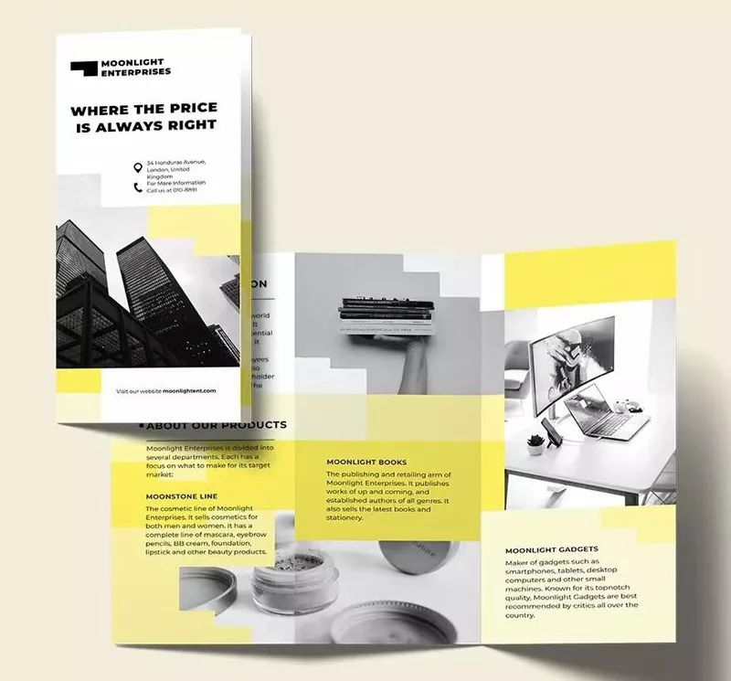前面谈到把折页封面设计成异形可以提升其吸引力,其实如果品牌调性合适、客户接受度广,从折页的造型上做改变更能让人眼前一亮,比如把折页设计成圆形、三角形、平行四边形等。