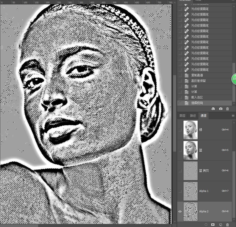 4.经过两次计算,面部瑕疵已经很明显啦,按Ctrl点击Alpha8载入选区,因为要得到的是暗部,所以载入选区后记得反选下