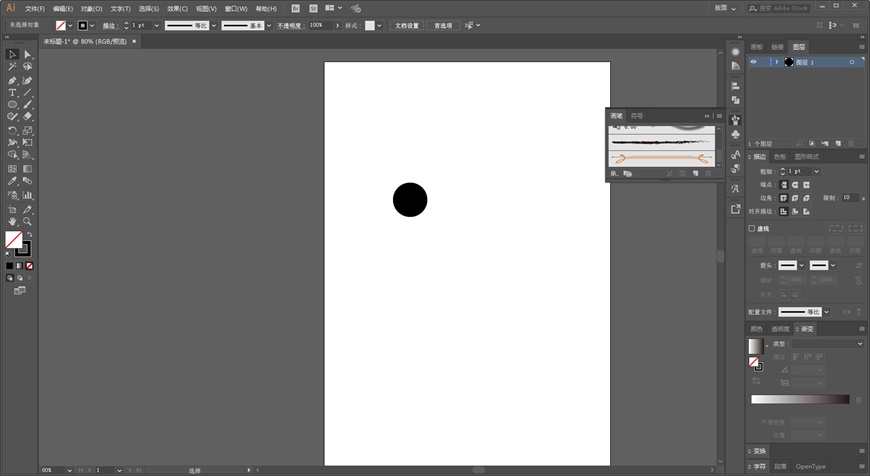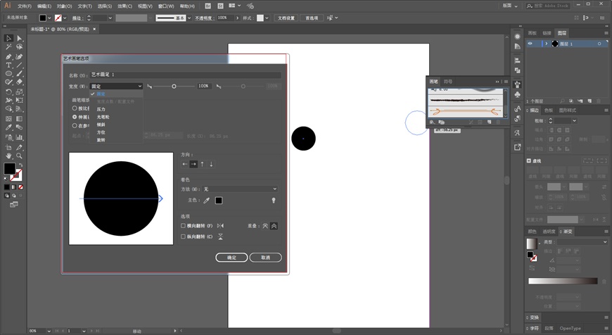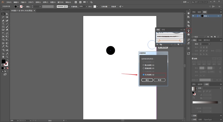 打开画笔面板,把圆直接拖进去,选择艺术画笔: