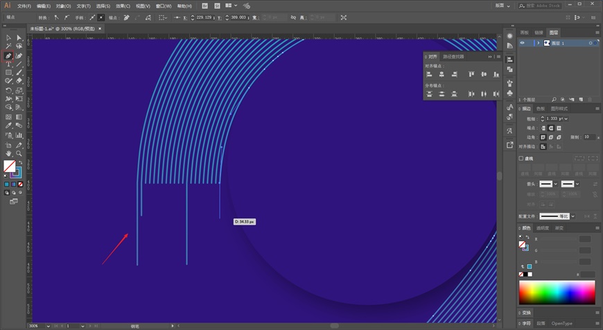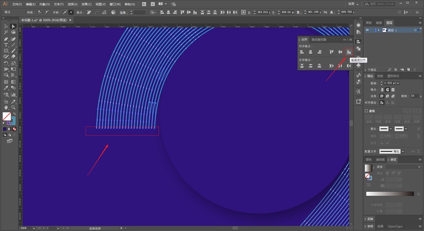 再进行细节的调整,按住shift键加选住箭头所指出的锚点,对齐工具中选择底部对齐: