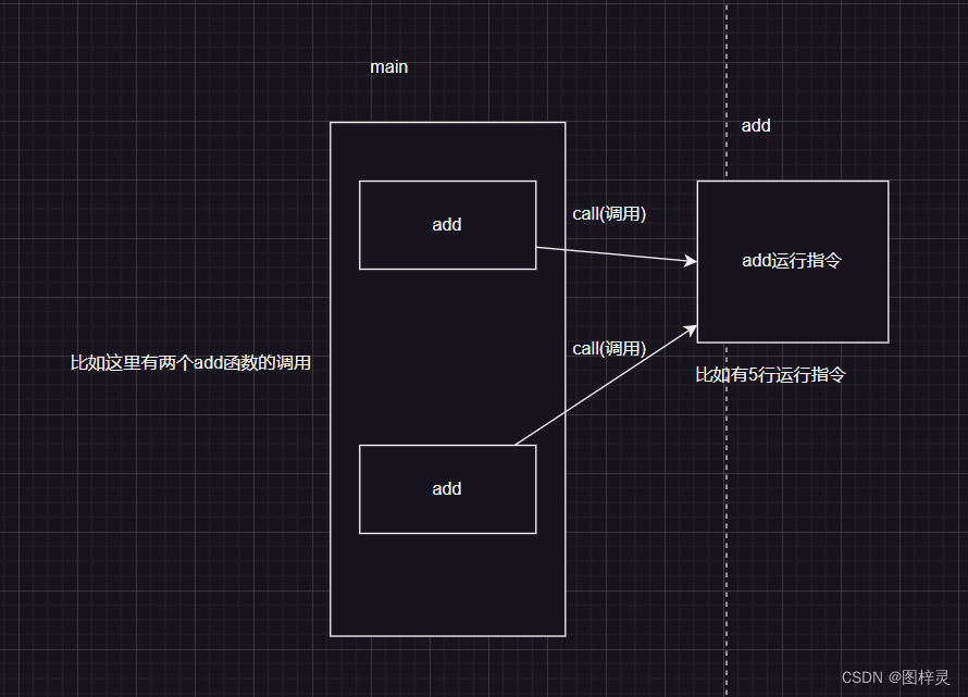 在这里大家大概的了解一下可执行程序的那种过程,上图第一次调用add是一条运行指令,call就相成调用的意思,跳转到函数,执行add运行指令,第二次调用add也是一条运行指令,然后调用add函数,跳转到add地址,此处的五行运行指令还是之前的那五行,所以一共是7行运行指令