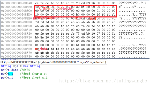 由于构造函数中m_data=new char[1],故重新在堆上分配了内存,地址8f30-8f5f为其头部标示,8f61-8f64为其尾部标示。