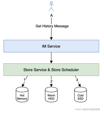 对于刚发送的消息可以放到Hot存储系统(可以用Redis)跟Warm存储系统,然后由Store Scheduler根据一定的规则定时将冷数据迁移到Cold存储系统。获取消息的时候需要依次访问Hot、Warm跟Cold存储系统,由Store Service整合数据返回给IM Service。