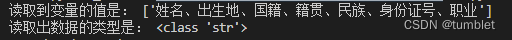 read_ID = config.get('身份信息', '身份信息') # 期望读出个列表类型的数据:['姓名、出生地、国籍、籍贯、民族、身份证号、职业']