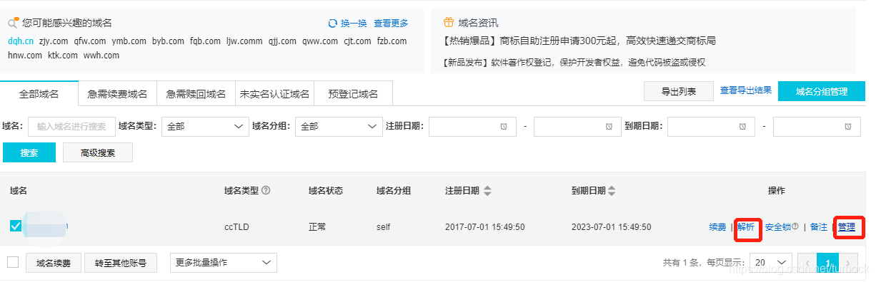 1.如下图域名控制台,点击对应域名的管理控制按钮,