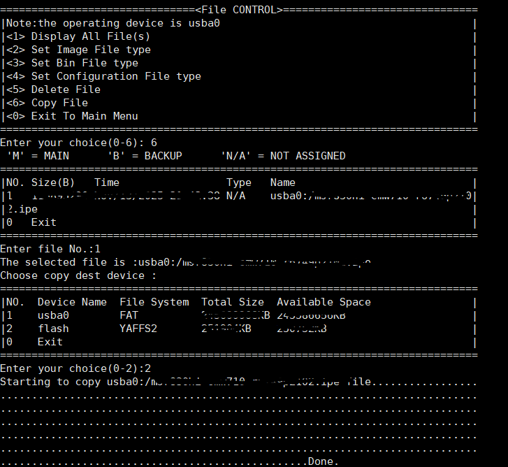 经过多次尝试,失败,再尝试。找到了解决办法。经过查询,IPE文件已经包含了路由器升级所需的所有文件,问题在于IPE文件在导入到路由器中,某些升级项只解压缩一部分bin文件。导致设备启动失败。只需要将文件完成导入到路由器flash中即可。此时需要使用U盘将相关文件,依赖Storage Device Operation,File Control 功能完成。