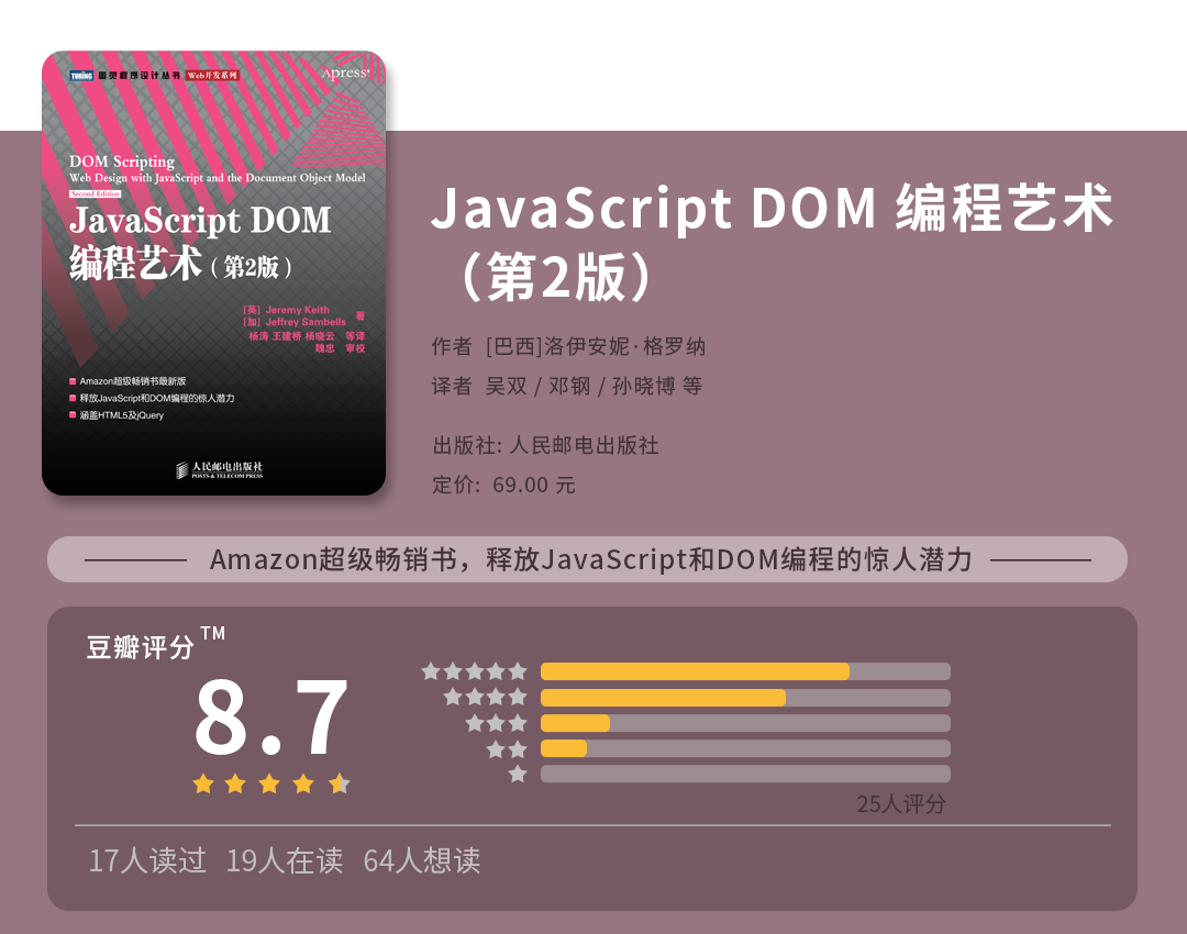 本书讲述了 JavaScript、DOM 和 HTML5 的基础知识,着重介绍 DOM 编程技术背后的思路和原则:平稳退化、渐进增强和以用户为中心等。这些概念对于任何前端 Web 开发工作都非常重要。本书将这些概念贯穿在书中的所有代码示例中,以便呈现用来创建图片库页面的脚本、用来创建动画效果的脚本和用来丰富页面元素呈现效果的脚本,最后结合所讲述的内容创建了一个实际的网站。