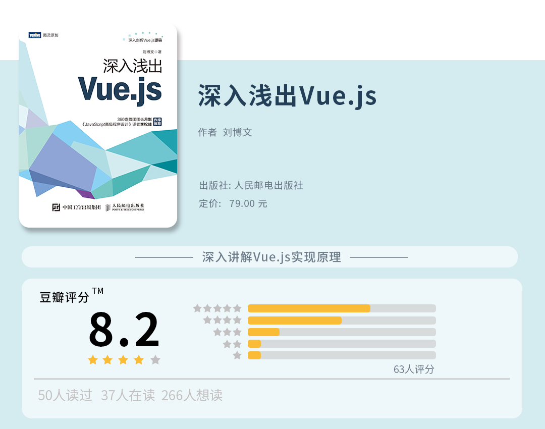 360 奇舞团团长月影和《JavaScript高级程序设计》译者李松峰作序推荐,作者首先简要介绍了 Vue.js;然后详细讲解了其内部核心技术“变化侦测”,这里会带领大家从 0 到 1 实现一个简单的“变化侦测”系统;接着详细介绍虚拟 DOM 技术,其中包括虚拟 DOM 的原理及其 patching 算法;紧接着详细讨论了模板编译技术,其中包括模板解析器的实现原理、优化器的原理以及代码生成器的原理;最后详细介绍了其整体架构以及提供给我们使用的各种 API 的内部原理,同时还介绍了生命周期、错误处理、指令系统与模板过滤器等功能的原理。