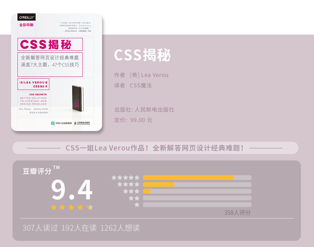 由 W3C CSS 工作组特邀专家,设计 CSS 语言的委员之一 Lea Verou 执笔,作者为我们揭示了 47 个鲜为人知的 CSS 技巧,主要内容包括背景与边框、形状、 视觉效果、字体排印、用户体验、结构与布局、过渡与动画等。本书将带领读者循序渐进地探寻更优雅的解决方案,攻克每天都会遇到的各种网页样式难题。
