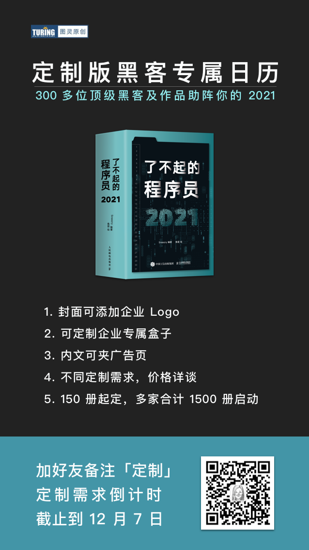 之前,这本《了不起的程序员2021》已经跟大家有过多次互动,大部分朋友已经对它很熟悉了。2021 年即将到来,不少小伙伴在为团队或者客户准备礼物,这款日历就很适合作为年会礼物,也很适合作为 2021 年新年伊始送出的礼物。于是,这次就跟大家唠唠「定制版」的事情。同时也告诉大家一声,因为时间关系,定制版项目开始倒计时。