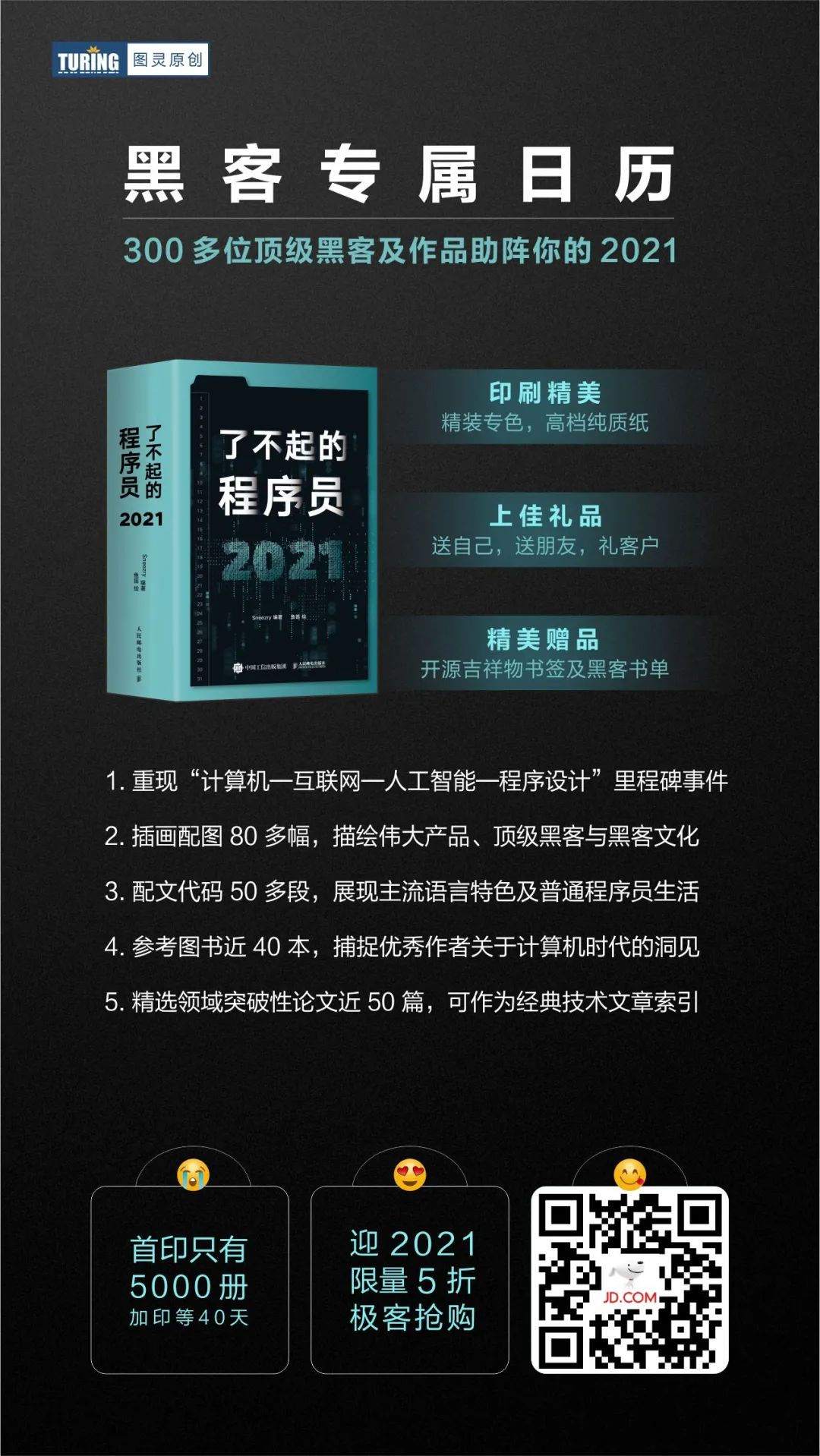 如果你对人类历史上这些伟大经典的项目与超凡卓群的黑客报以浓厚的兴趣,致敬缅怀也罢、观摩学习也罢、汲取动力也罢,这本《了不起的程序员2021》非常值得收藏。虽然无法提供详尽的细节,但是可以作为非常不错的索引指南——365 天,每天一个 IT 事件或者黑客,让你的 2021 更有极客味儿。