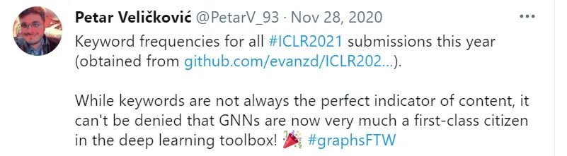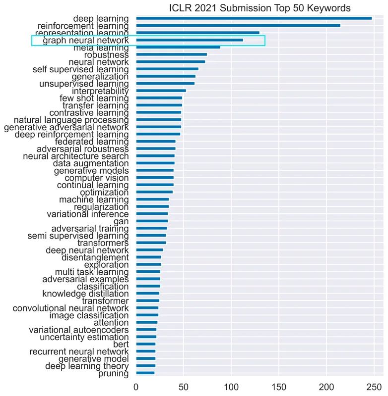 拿ICLR来说,也就是国际表征学习大会(International Conference on Learning Representations),这是深度学习领域的顶级大会。几个月前,有人分析了提交给该大会的论文中的高频词[1],发现图神经网络(GNN)赫然排在第4位,仅次于「深度学习」「强化学习」和「表征学习」。