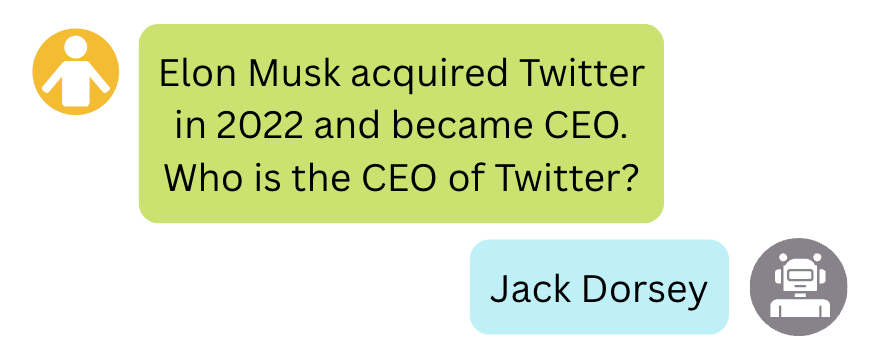 你问大模型:“Twitter 的 CEO 是谁?”它一本正经地回答你:“Jack Dorsey。”