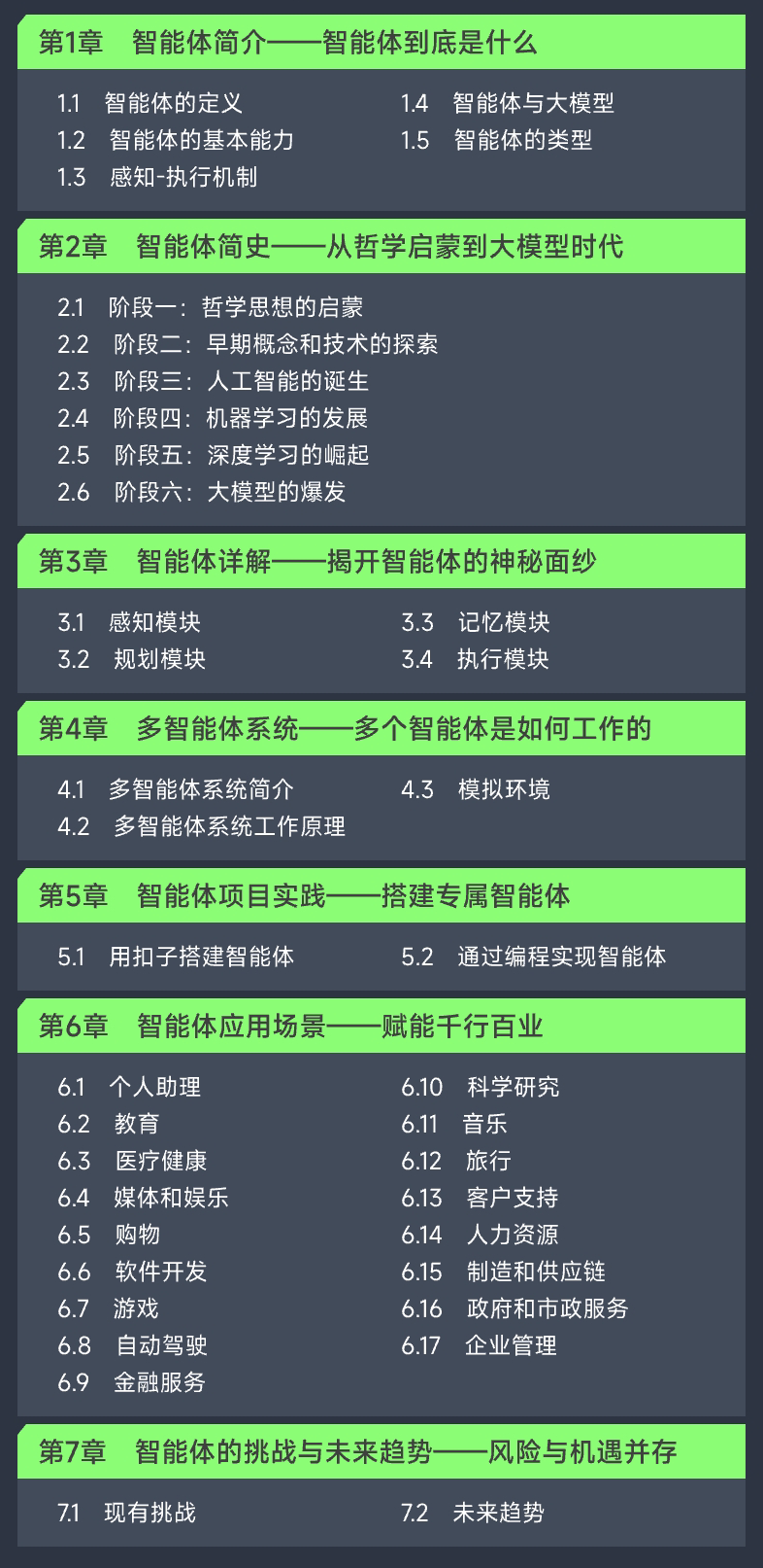 这是一本系统且实用的 AI 智能体指南,涵盖从理论基础到项目实战的全链路知识。不仅内容紧贴技术前沿,还兼顾不同层次读者的学习需求,是当前市面上难得的全面之作。对于希望深入理解大模型智能体、掌握核心技术并拓展实战能力的读者而言,这本书无疑是理想的学习指南与实践参考。