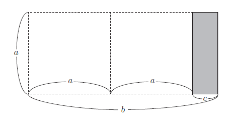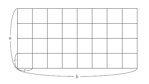 如此一来,问题就变成了如何用面积相同的正方形填满这个新的长方形。由于现在这个长方形的较短边是c,所以我们从中剪掉面积为c × c 的正方形。