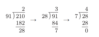 那么此时,在最后一步实现了整除的除数7,这就是91 和210的最大公约数。