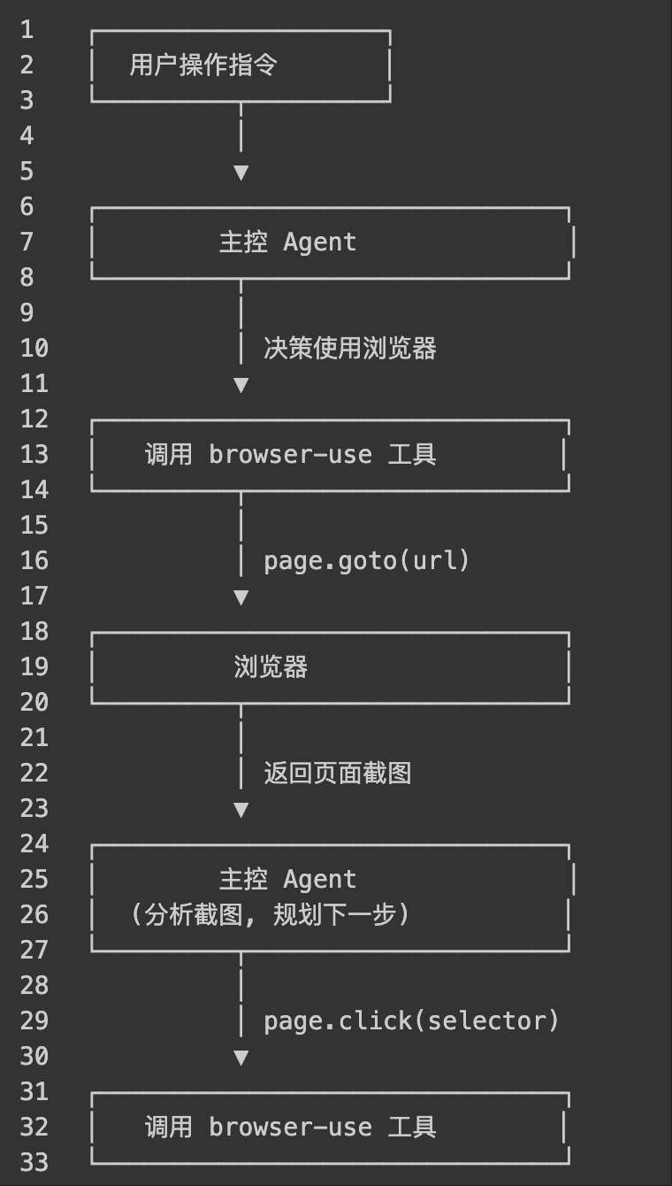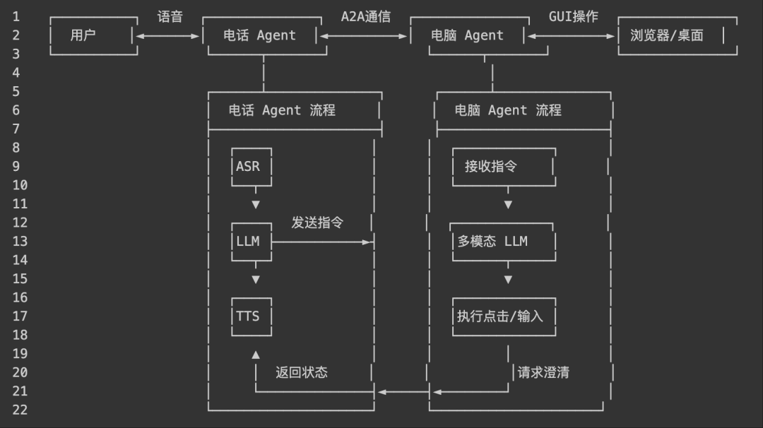 双 Agent 架构: 两个独立的 Agent,一个负责语音通话 ( 电话 Agent),一个负责操作浏览器 ( 电脑 Agent)