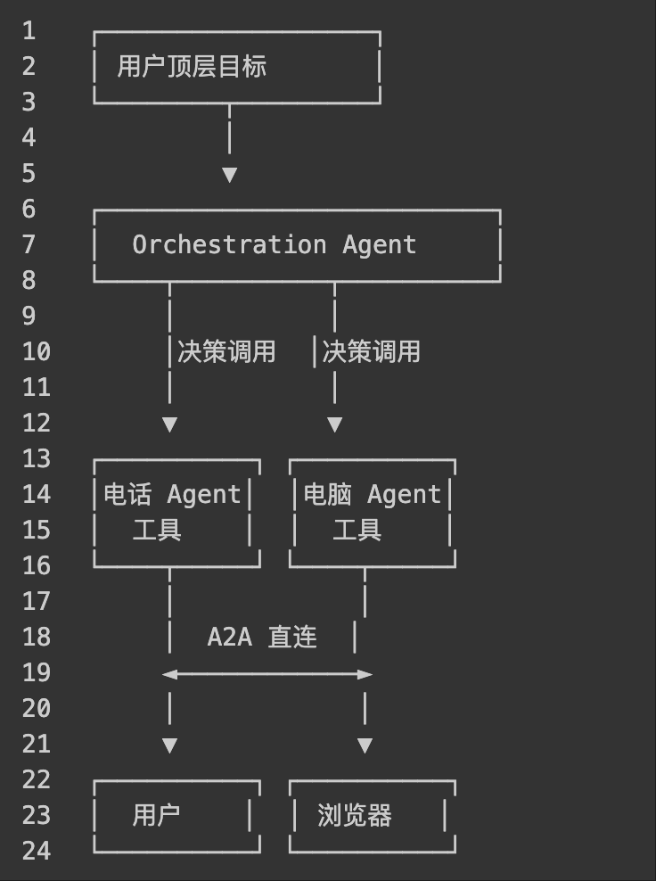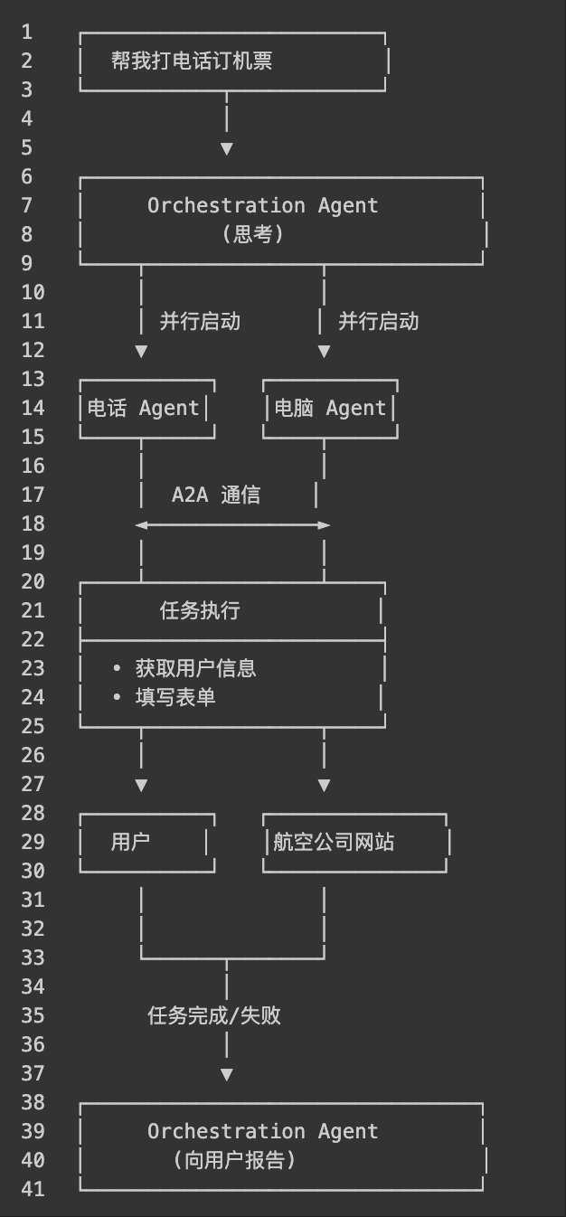 Agent 间协同通信: 两个 Agent 必须能高效双向通信。电话 Agent 获取的信息需立刻告知电脑 Agent,反之亦然。这可以通过工具调用实现