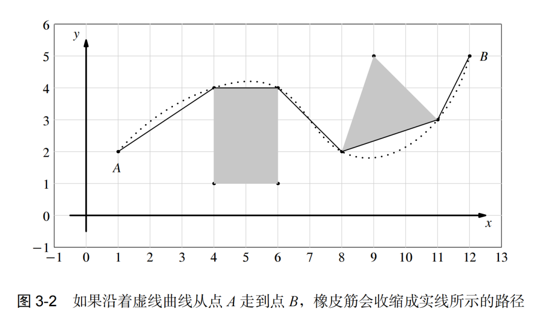 第三章转向计算几何与优化问题。作者提出了一个极具创造力的比喻:橡皮筋。当橡皮筋在桌面上绕开障碍物并收紧时,它自然形成的轨迹,就是最短路径的直观答案。这样的比喻让学生不仅能直观掌握二维平面上的算法,还能逐步扩展到三维空间中的复杂问题,例如折线与多边形的最优计算。