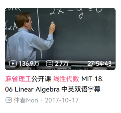 这本书的教学资源完备、丰富。他在麻省理工学院OpenCourseWare网站上开设的线性代数课程已获得上百万次观看,被认为是数学教学的典范,可以配合本书使用。同时视频也在B站有开放资源,可配套学习使用。