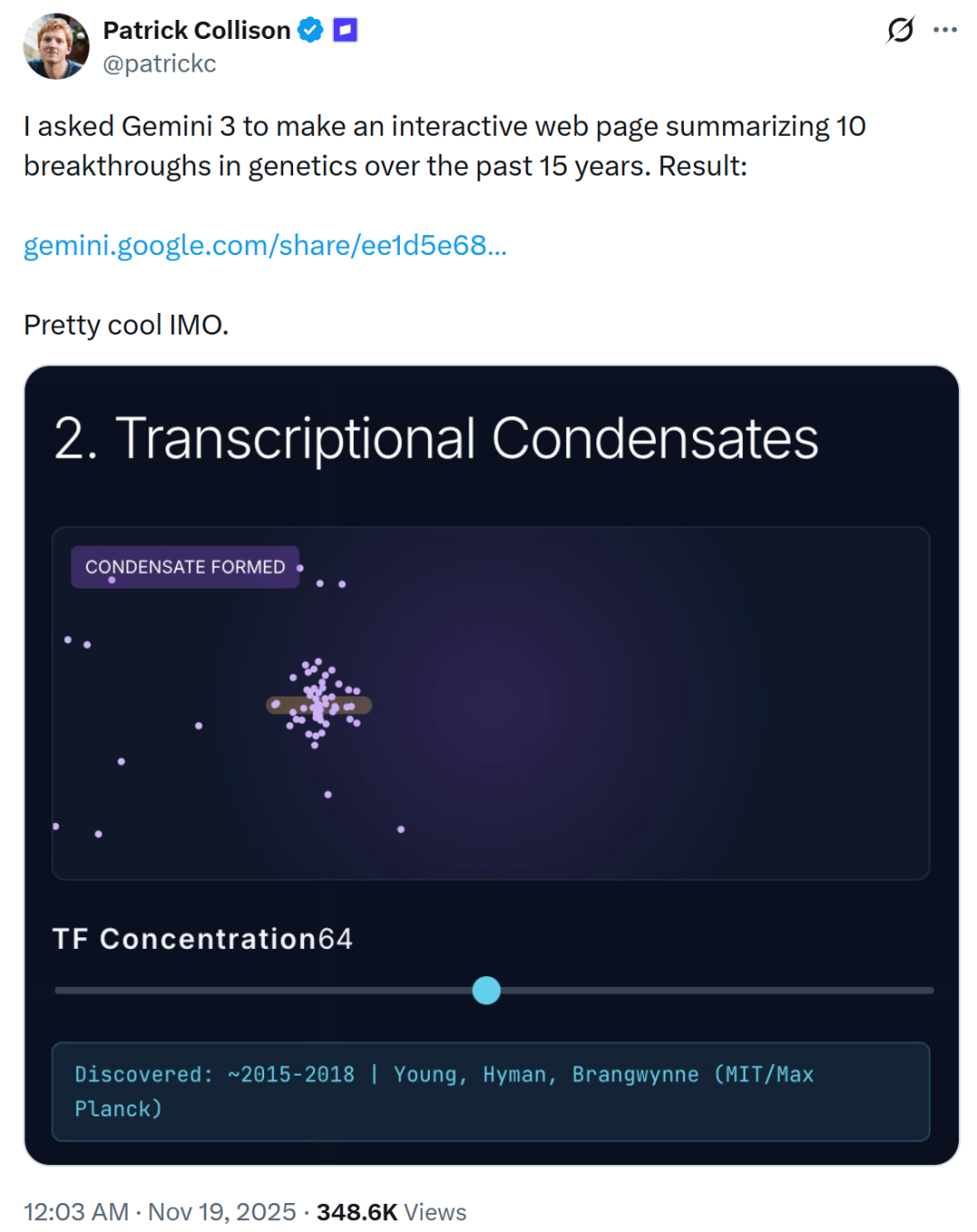 Stripe CEO 帕特里克·科里森发帖说,Gemini 3 成功帮他构建了一个交互式网页,总结了过去 15 年基因学领域的 10 项突破。他形容这挺酷的。