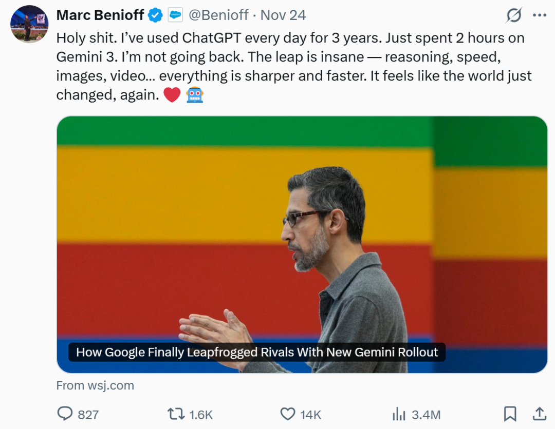 可没想到,近日他突然在 X 上发了一条震撼整个 AI 圈的帖:“我每天都用 ChatGPT 有 3 年了。今天花了 2 小时试用 Gemini 3,我不回去了。”