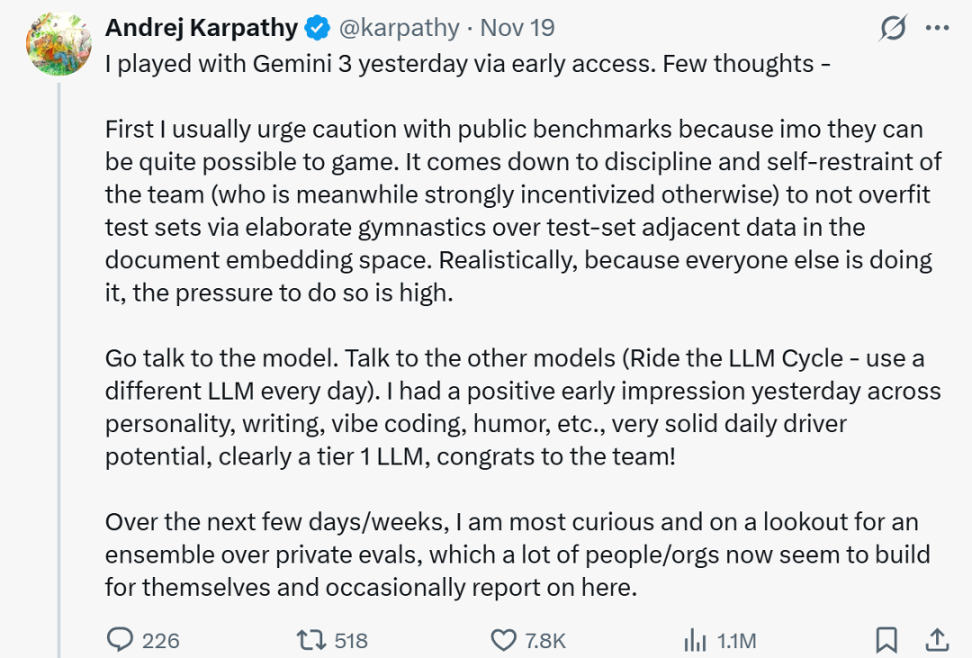结果转头就对 Gemini 3 来了个真香现场。这不是他的态度转变的问题,而是整个行业正在发生的一个非常明显的趋势,大模型的迭代速度,已经快到连巨头都喘不过气。