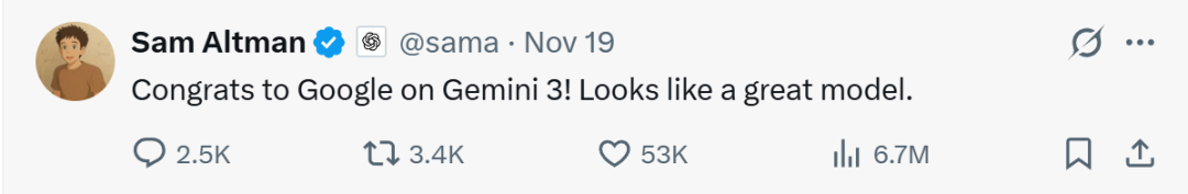 硅谷的领军人物纷纷注意到 Gemini 的重磅发布。OpenAI CEO 萨姆·阿尔特曼在 X 上祝贺谷歌:“祝贺谷歌发布 Gemini 3!看起来是个很棒的模型。”