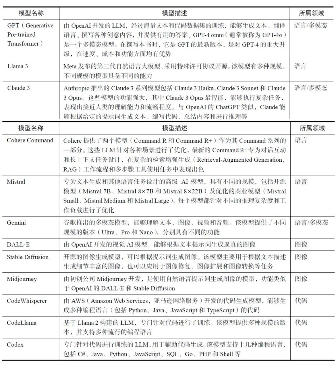 除了 ChatGPT,下表也列出了当前的主流生成式 AI 模型,并按照不同的生成领域(语言、图像、代码或多模态)进行了分组。