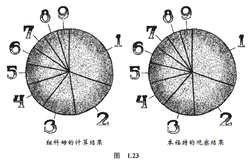 基于这一观察结果,西蒙·纽科姆计算出首位数字应当具有的理论分布。幸甚,幸甚!这种理论分布与弗兰克·本福特在五十年后发现的真实分布奇迹般地吻合了(图 1.23)。在理论与具体实验的结果相符时,科学家会感到异常高兴。现在我们可以确信自己清楚地了解了发生的事情。