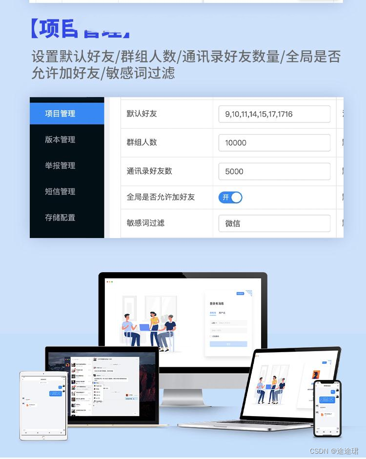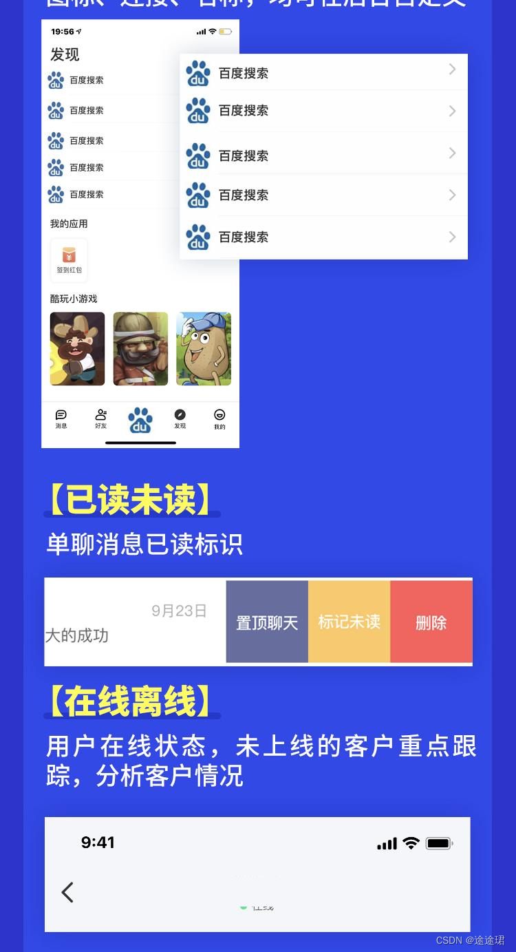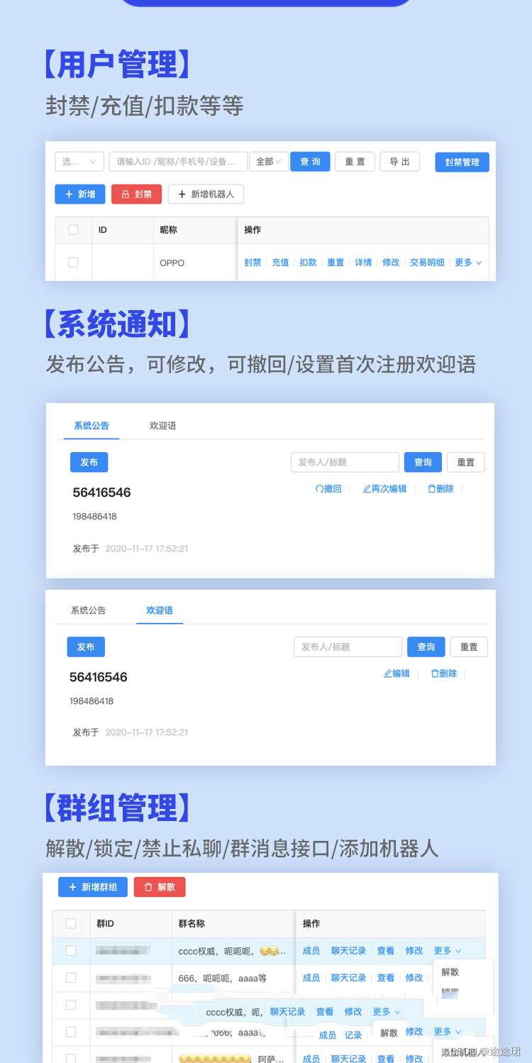 群聊:快速实现群组聊天,单人禁言、全员禁言、群红包、设置管理员、群转让、踢群成员等灵活的群组成员和权限管理,消息历史记录支持漫游大群且可进一步提升。