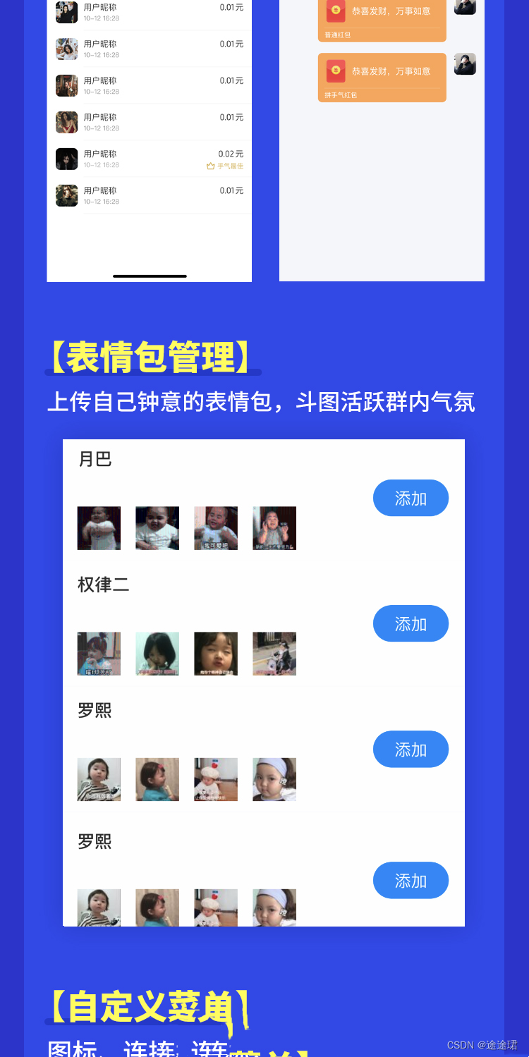 支持文字、表情、图片、语音、音视频通话、单聊、群聊、一键群发、发现、朋友圈、红包等完备的IM功能。
