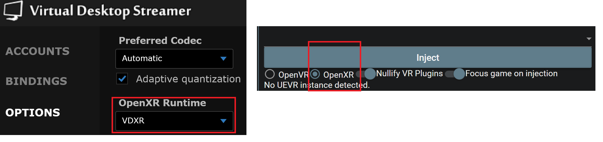 如果你是一体机且有VD串流工具的用户,目前UEVR最佳的方式是用VD的VDXR模式来注入游戏,因为如果你没有VD串流工具或者是PCVR用户,则无论你选择OpenVR还是OpenXR,都是会依托于SteamVR启动游戏,会多一些SteamVR带来的负担