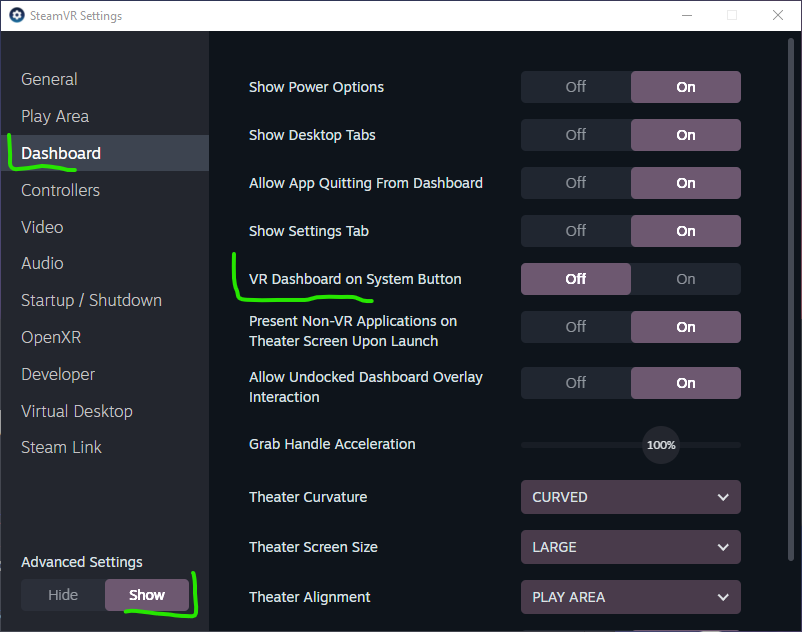 而模拟Xbox手柄的Back和Start键是由VR手柄上的菜单键来实现的。短按对应于Start,长按对应于Back。用VDXR启动,能比较顺利和方便地用VR手柄的菜单键按出Xbox手柄的Back和Start键。但如果是依托于SteamVR启动游戏。菜单键会和SteamVR的菜单键冲突。所以需要做以下操作:
