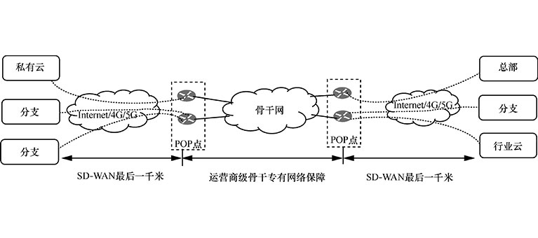 该种场景中,SD-WAN 被用来做企业分支至 POP 点的接入,并且在接入的过程中,可以将数据进行加密,保证数据传输的安全性。由于 SD-WAN 支持混合链路接入,使得分支节点的部署更加灵活。SD-WAN 本身开通简单的特性还能加快企业分支节点组网部署和开通时效性、简化企业运维、降低企业组网成本以及支持站点弹性增删及灵活部署。