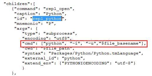 windows下打开E:\Sublime Text 3\Data\Packages\SublimeREPL\config\Python目录下的Main.sublime-menu文件,找到"id": "repl_python"所在行,将这个JSON对象中args属性下cmd属性值改为["python", "-i", "-u", "$file_basename"],如图所示: