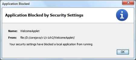 application blocked by security settingsName: WelcomeAppletFrom: file:/D:/corejava/v1/v1ch2/WelcomeApplet/your security settings have blocked a local application from running