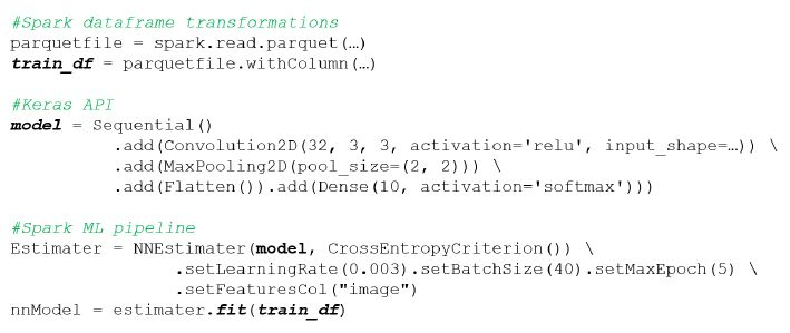 下面来看一下具体的例子。有人和我说不要放太多代码在里面,用 Spark 构建一个 RDD,对大规模数据进行分布式处理。对各种各样的数据源,不管是数据仓库的方式,还是读写数据库,或者是读写各种各样的分布式文件系统,可以直接使用 Spark Dataframe。下面的图片是说,如能够使用刚才训练的模型,就可以使用我们的模型推理进行大规模分布式应用,在自己 Keras 等框架内都很容易将我们深度学习模型集成在这些流水式处理或者在线处理中,而且在这个背后也可以透明地使用像 Analytics Zoo 的工具,对模型进行压缩加速,包括至强深度学习加速指令对它进行加速;同时可以跑在大规模集群上进行分布式推理。