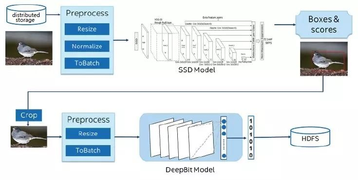 下图是我们在两年前和京东的一个合作。京东带来的几亿张图片,存储在一个大规模分布式大数据集群里,我们做的事情是要对这些图片——识别物品。比如,这张图片上是一只鸟,然后提取特征。从深度学习、机器学习来说,不是特别复杂的应用,做物品识别、提取持证就可以了。但是事实上发现,在对大规模的图片读取数据,对图片进行分布式处理,再进行模型推理;当识别物品时,对物品进行抽取,再进行处理,再提取特征等,把整个端到端流水线在大规模的图片里是跑不好的。当要把这些机器学习、深度学习等技术应用到实际应用中,会有一个比较大的断层,今天很多的科学家做了非常多的深度学习、机器学习的有效工作,但是如何将新技术、新创新应用到现实环境中,特别是在一些非常大规模、大数据生产系统中,从软硬件架构上有非常大的一个断层。这就是为什么我们会去开源,像BIGDL,特别是 Analytics Zoo 平台,能够将不同的模块不管是用 TensorFlow 还是用Keras,将这些不同模块的程序能够无缝运行在端到端流水线上,大大提升开发效率。