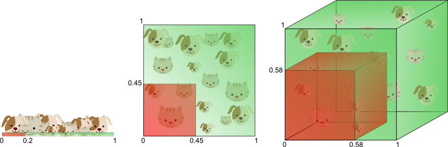 图8用不一样的方式来描述了上述现象,比如现在我们用一个值在(0-1)之间的特征来分类训练数据,假定这个特征对猫与狗来说是可以区分的,如果我们想要覆盖特征空间的20%,我们便需要猫和狗总数的20%,如果添加一个特征,在2维空间中,要覆盖特征空间的20%,我们便需要在每个维度上取猫和狗的总数的45%,(0.45^2=2),同理,3维空间中需要在每个维度上取58%。