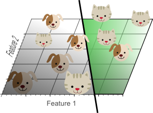 下面不如正题,考虑我们有一堆猫和狗的图片,现在要做一个分类器,它可以把猫和狗自动并且正确分类。所以对这个两个类别,首先需要一组描述符,使这两个类别可以被表示为数字,分类器可以使用数字来决定类别(如Logistic Regression 映射到sigmod后,与阈值比较大小来确定类别),本例中可以用颜色来进行分类,我们用红绿蓝三原色来表示,即平均的红色,平均的绿色,平均的蓝色这三个数值,结合三个给定的权重, 来最终构成一个线性分类器,决定最终的分类标签: