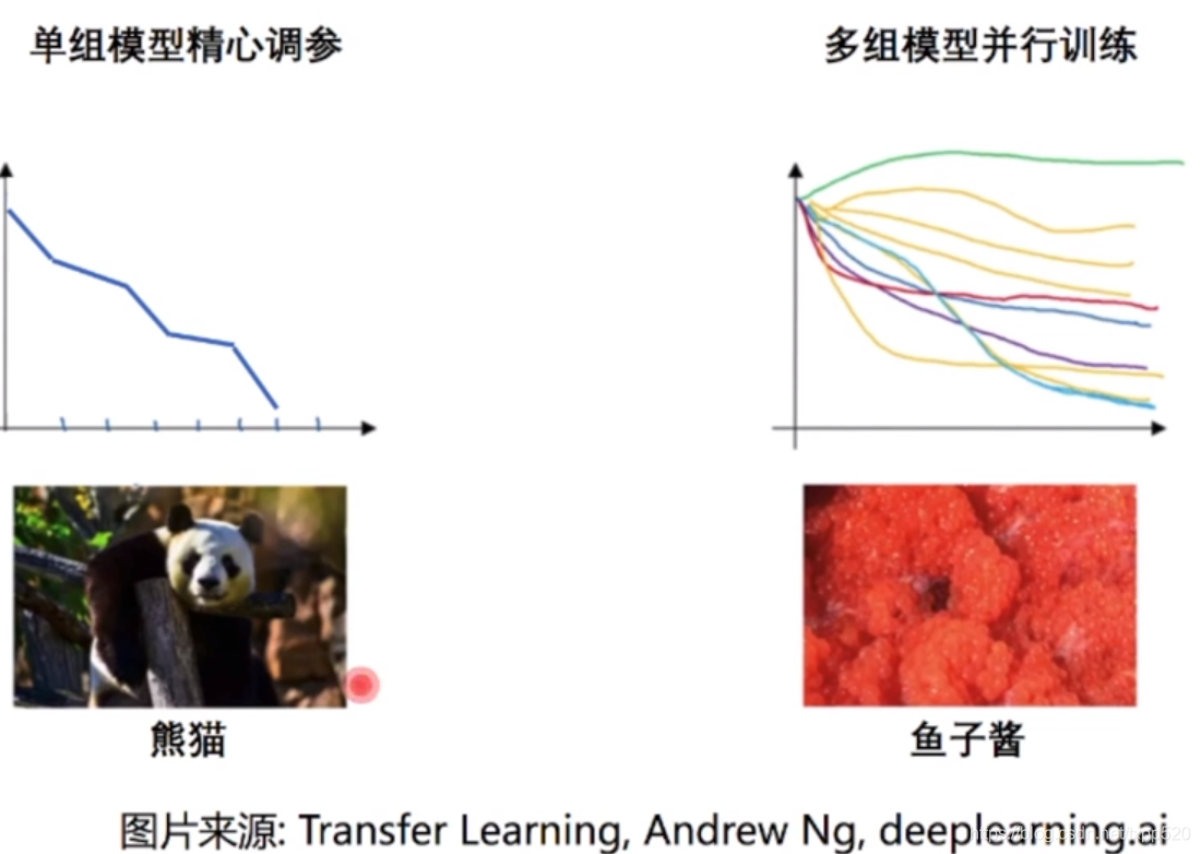 42.05 熊猫模型:我们有个模型,非常重要,非常大,我们每天调一点点。它的loss 一天比一天降低一点,这是一个人工的过程。前提是 调参者是个专家。知道自己的方向是对的,就能训练出来一个好的模型。X轴是 时间,y 是 loss