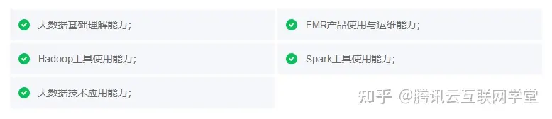 通过该认证可有效验证你是否具备使用大数据技术及工具进行大数据程序开发,以及基于腾讯云EMR产品开通、部署和使用Hadoop大数据系统的能力。