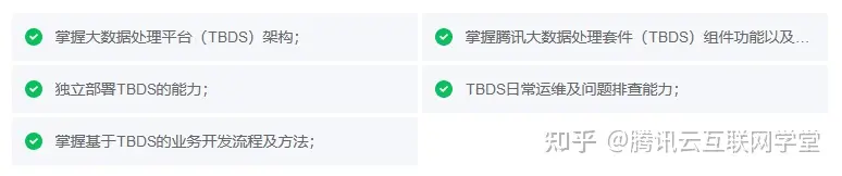 通过该认证可有效验证你是否具备腾讯云大数据处理套件(TBDS)的部署规划能力、部署安装动手能力、运维实操能力以及基于TBDS完成大数据业务开发工作的能力。
